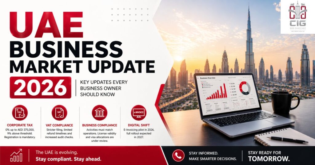 The UAE business landscape in 2026 is becoming more structured with stricter compliance requirements, corporate tax implementation, VAT enforcement, and digital transformation initiatives like e-invoicing. Businesses that stay compliant and adapt early will benefit from faster growth and long-term stability.
